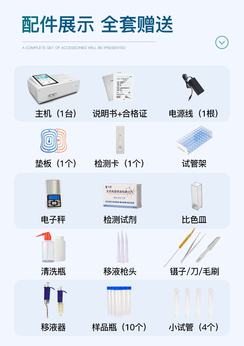 食品添加劑:二氧化硫、雙氧水、亞硝酸鹽、硝酸鹽、苯甲酸鈉、山梨酸鉀、糖精鈉、甜蜜素、木耳硫酸鎂等有毒有害物質:甲醛、吊白塊、硼砂、過氧化苯甲酰、溴酸鉀、羅丹明B、三聚氰胺、蘇丹紅、工業堿、尿素、明礬等果蔬:農藥殘留(酶抑制率法)病害肉:組胺、揮發性鹽基氮重金屬含量:鉛、鎘、鉻、汞、砷、錫、鎳、鋁等水酒飲品分析:酒中甲醇、乙醇、乳品及牛奶中蛋白質調味品成分: 食醋的總酸、醬油的總酸、芝麻油純度、谷氨酸鈉、醬油氨基酸態氮、食鹽中亞鐵氰化鉀、食鹽中碘等食用色素類:紅色色素(胭脂紅、莧菜紅、莧菜紅)、黃色色素(檸檬黃、日落黃)、藍色色素(亮藍)等蜂蜜成分:果糖和葡萄糖、蔗糖、淀粉酶、酸度等食用油脂:過氧化值、酸價等