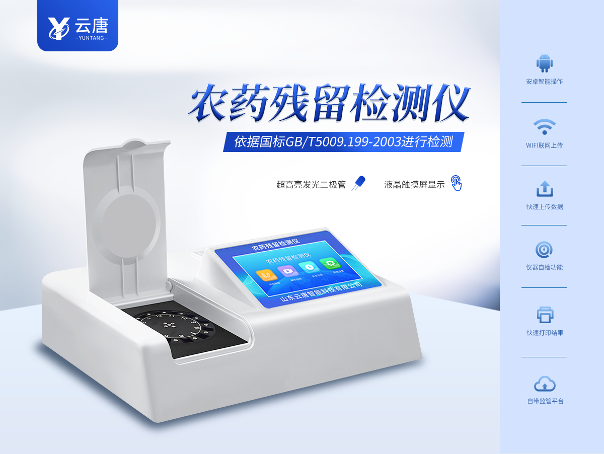 山東云唐智能科技有限公司生產的農藥殘留檢測儀廣泛應用于主要用于蔬菜、水果、茶葉、糧食、農副產品等食品中農藥殘留的快速檢測,依據國標GB/T5009.199-2003進行檢測,適用于果蔬茶生產基地以及農貿批發銷售市場現場檢測,餐館、學校、食堂、家庭果蔬加工前的安全速測等。