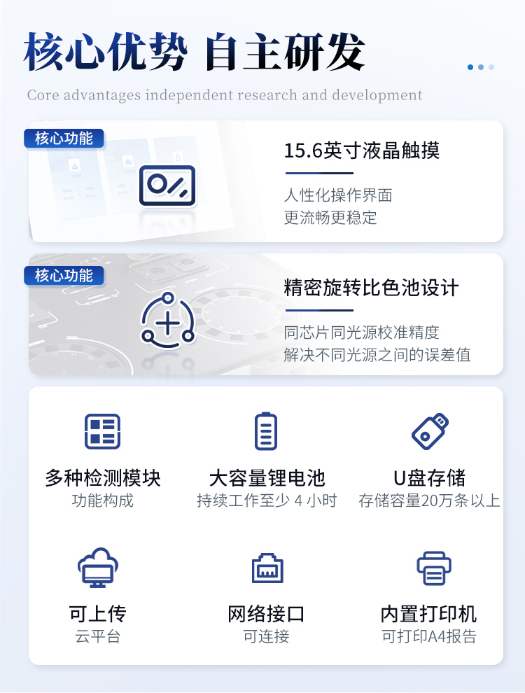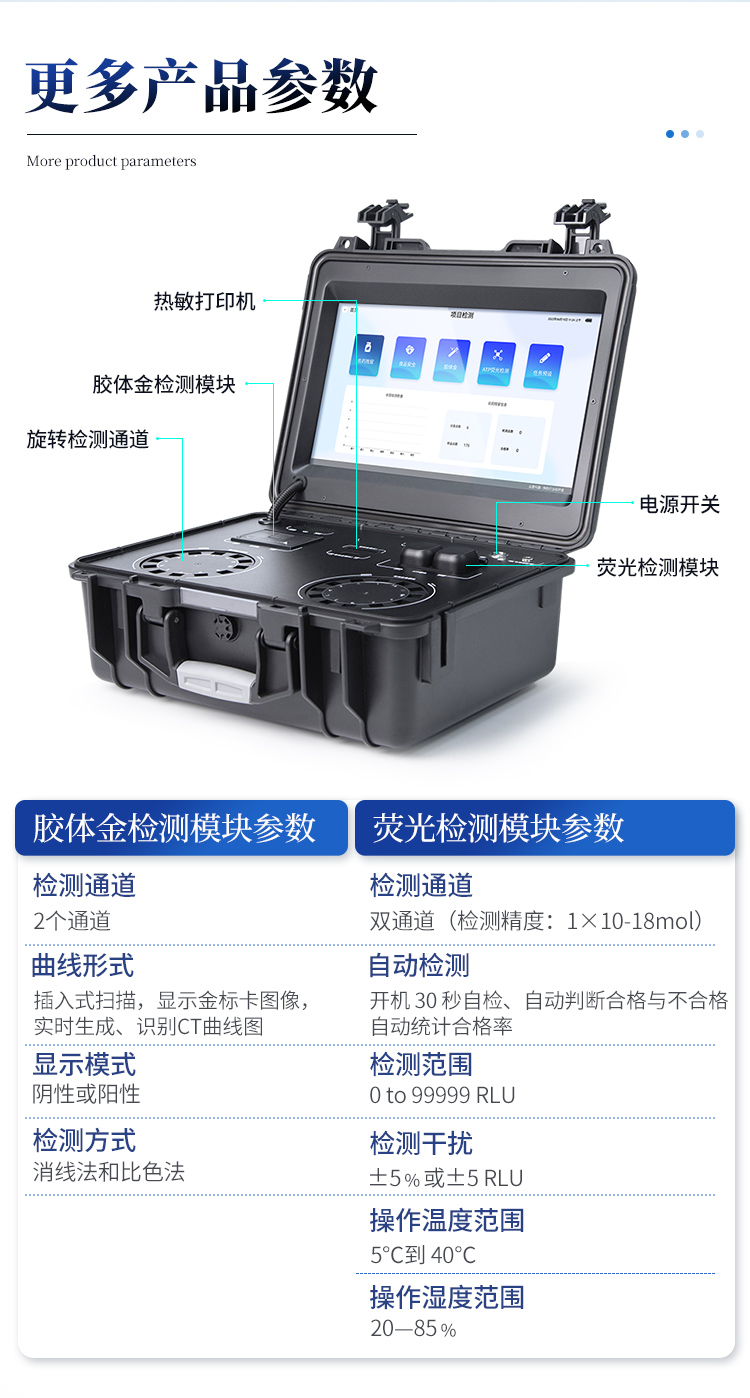| 儀器采用臺式一體化系統(tǒng)檢測技術(shù),將分光光度模塊、膠體金檢測模塊、新型農(nóng)殘檢測模塊、數(shù)字化管理模塊、無線通訊模塊高度集成于一體,支持檢測200種食品安全檢測項目,同時預(yù)留升級檢測方法。 | 儀器檢測模塊標(biāo)準(zhǔn)化、智能化,可隨意自由組合。檢測箱體內(nèi)置多個標(biāo)準(zhǔn)檢測單元,檢測模塊可以調(diào)整配置。 | 顯示屏幕:儀器采用10.1英寸豎向液晶觸摸屏顯,搭配運行安卓智能操作系統(tǒng),主控芯片采用ARM Cortex-A7,RK3288/4核處理器,主頻1.88Ghz,操作方便,性能更強。 | 檢測通道:≥24通道;采用精密旋轉(zhuǎn)比色池設(shè)計,使用同芯片同光源校準(zhǔn)精度,解決不同光源之間的誤差值,更加準(zhǔn)確**。(1-12通道間誤差0.1%,***:**202022821055.2) | 儀器光源:高精度進口四波長冷光源,每個通道均配置 410、520、590、630nm 波長光源,標(biāo)配**的光路切換裝置,專利光路切換功能可實現(xiàn)64波長,并且所有檢測項目可實現(xiàn)所有通道同時檢測。 | 設(shè)備可一鍵校準(zhǔn),自動保存校準(zhǔn)數(shù)據(jù),自動對比校驗,得到精準(zhǔn)光源,采用Android SP存儲數(shù)據(jù),光源數(shù)據(jù)永不丟失,方便每一次使用。 | 通訊接口:配備無線通信模塊、可選配4G(APN)通訊模塊和藍牙傳輸,同時具有雙USB接口以及RJ45網(wǎng)線接口,可以多方式實現(xiàn)數(shù)據(jù)保存及數(shù)據(jù)傳輸。 | 存儲方式:支持U盤存儲,標(biāo)準(zhǔn)USB接口,免驅(qū)動安裝。檢測結(jié)果存儲容量20萬條以上,可生成Excel表格進行拷貝,并具有登錄保護功能。 | 智能化操作系統(tǒng): | 1、操作系統(tǒng):儀器可在同一檢測界面自動對應(yīng)相關(guān)檢測通道,一次性選擇1-12個樣品名稱,無需退出界面,節(jié)省操作時間。并可以對每個通道屬性和樣品信息單獨進行編輯,例如送檢單位、人員,檢測人員等,打印時勾選打印顯示。 | 2、數(shù)據(jù)集成系統(tǒng):設(shè)備首頁自動匯總分析檢測數(shù)據(jù),包含:周檢測數(shù)據(jù)、月檢測數(shù)據(jù),總檢測數(shù)量,均包含檢測總數(shù),合格數(shù),不合格數(shù),以及相關(guān)柱形分析圖,各項檢測數(shù)據(jù)一目了然,無需電腦查詢,更加快捷直觀。 | 3、數(shù)據(jù)庫系統(tǒng):十幾項數(shù)據(jù)庫分類管理儀器:包含項目類型、項目數(shù)據(jù)、檢測數(shù)據(jù)、歷史記錄、國標(biāo)信息、曲線信息、采樣信息、檢測信息、受檢信息、復(fù)核信息、圖表信息、光源校準(zhǔn)信息、打印樣式信息、樣品庫信息等等,數(shù)據(jù)庫之間互相協(xié)調(diào)聯(lián)動保證數(shù)據(jù)的真實完整性。同時產(chǎn)品數(shù)據(jù)庫以及歷史檢測記錄支持一鍵檢索功能。 | 4、限量規(guī)判系統(tǒng):具有限量查詢、添加物質(zhì)合規(guī)判定系統(tǒng)。檢測出結(jié)果后,系統(tǒng)自動調(diào)用系統(tǒng)數(shù)據(jù)庫中相關(guān)國標(biāo)進行比對判定,客觀顯示判定結(jié)果是否合格。 | 5、項目預(yù)設(shè)系統(tǒng):儀器具有任務(wù)預(yù)設(shè)模塊,一鍵提前預(yù)設(shè),給出方便快捷的新檢測方案,每一個任務(wù)分別可以設(shè)置不同的樣品、批次、編號、來源、備注、抽樣信息、檢測信息、受檢信息、復(fù)核信息等更多信息。樣品送檢時一鍵調(diào)取保存信息,并可多次調(diào)取,大大提高檢測效率。 | 6、數(shù)據(jù)監(jiān)管系統(tǒng):同步對接監(jiān)管平臺,數(shù)據(jù)可局域網(wǎng)和互聯(lián)網(wǎng)數(shù)據(jù)上傳,檢測結(jié)果可直接傳至食品安全監(jiān)管平臺。進行區(qū)域食品安全監(jiān)管及大數(shù)據(jù)分析處理與數(shù)據(jù)統(tǒng)計,監(jiān)測區(qū)域食品安全長短期動態(tài)及問題預(yù)估、預(yù)警。 | 7、全新打印系統(tǒng):內(nèi)置全新打印機,新創(chuàng)自定義打印方式,可按需靈活勾選控制:產(chǎn)品合格證(國家農(nóng)業(yè)部標(biāo)準(zhǔn)要求),二維碼,抽樣信息、檢測信息,受檢信息、復(fù)核信息、抽樣日期、檢測日期等信息的打印。 | 8、A4紙版本報告打印功能(可選配):設(shè)備擁有兩種結(jié)果展示方式,可以自動生成A4打印模板和小票打印模板兩種樣式,可通過WiFi及網(wǎng)線等方式鏈接外置打印機可進行打印。 | 供電模式:儀器交直流兩用,直流12V供電,可連接車載電源,可配6ah大容量充電鋰電池,電量可實時顯示,方便戶外流動測試。 | 膠體金檢測模塊:采用雙通道CMOS成像處理技術(shù)及膠體金免疫層析技術(shù),可同時讀取雙膠體金卡數(shù)據(jù),自動采集、處理分析,將檢測結(jié)果顯示,并可根據(jù)參考限值自動判斷檢測結(jié)果,可檢測常見的獸藥殘留、生物毒素、抗生素、違禁添加物等。 | 1、探測技術(shù):CMOS成像探測; | 2、檢測通道:2通道,可同時讀取2個膠體金卡數(shù)據(jù); | 3、檢測方式:消線法和比色法; | 4、顯示模式:陰性或陽性; | 5、曲線形式:直插式掃描方式,顯示金標(biāo)卡圖像,實時生成、識別CT曲線圖,無需手動調(diào)整,完成檢測后自動退出檢測卡。兼容市場上其他金標(biāo)卡,使用耗材不受限制。 | 儀器具備遠程升級功能,可定向分客戶分儀器更新,開機后自動更新,并可持續(xù)性免費更新系統(tǒng)版本,無需像傳統(tǒng)產(chǎn)品返廠更新,節(jié)省時間及人力成本并