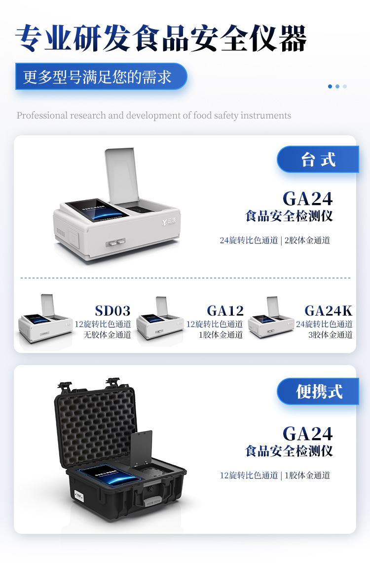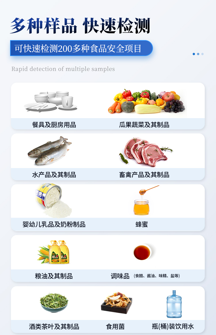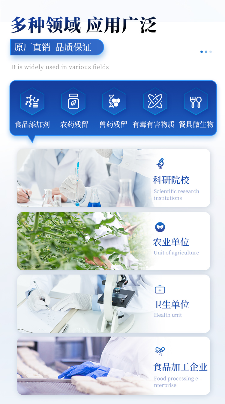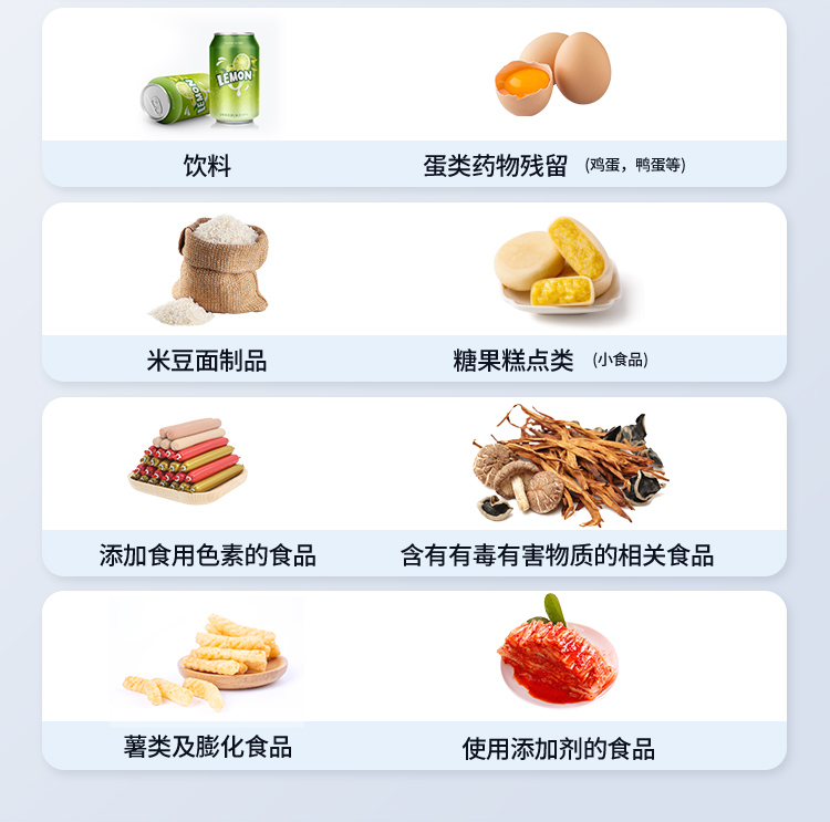 | 食品添加劑:二氧化硫、雙氧水、亞硝酸鹽、苯甲酸鈉、硝酸鹽、山梨酸鉀、山梨酸、安賽蜜、糖精鈉、甜蜜素、木耳硫酸鎂、茶多酚等 | 有毒有害物質(zhì):醛、吊白塊、硼砂、面粉中鋁、硫酸鋁鉀、過氧化苯甲酰、溴酸鉀、羅丹明B、蘇丹紅、工業(yè)堿、尿素、明礬等 | 食用油脂:過氧化值、酸價等 | 果蔬:農(nóng)藥殘留(酶抑制率法) | 病害肉:組胺、揮發(fā)性鹽基氮 | 重金屬含量: 鉛、鎘、鉻、汞、砷、錫、鎳、鋁等 | 瘦肉精激素:鹽酸克倫特羅、沙丁胺醇、萊克多巴胺、己烯雌酚等 | 抗生素殘留:四環(huán)素類、硝基呋喃類、磺胺類、β-興奮劑類、沙星類、磺胺類、喹諾酮類,甲砜霉素,氟苯尼考,金剛烷胺、替米考星、慶大霉素、林可霉素、鏈霉素、恩諾沙星、環(huán)丙沙星、頭孢啦啶、青霉素、阿莫西林等 | 水產(chǎn)品安全類:孔雀石綠、氯霉素、呋喃妥因、呋喃西林、呋喃它酮、呋喃唑酮等 | 蛋類藥物殘留:氯霉素,四環(huán)素,磺胺類,喹諾酮類,呋喃西林,呋喃它酮,呋喃妥因,呋喃唑酮,氟苯尼考,阿莫西林、頭孢氨芐、紅霉素、鏈霉素等 | 真菌毒素殘留:食用油、糧食及飼料中黃曲霉毒素B1、黃曲霉毒素總量,奶中黃曲霉毒素M1、嘔吐毒素、玉米赤霉烯酮、赭曲霉毒素A、T2毒素、伏馬毒素等 | 酒類及乳品牛奶中蛋白質(zhì):中甲醇、乙醇、乳品及牛奶中蛋白質(zhì)、乳品硫氰酸鈉、三聚氰胺, | 蜂蜜成分:果糖和葡萄糖、蔗糖、淀粉酶、酸度等 | 調(diào)味品成分:食醋的總酸、醬油的總酸、芝麻油純度、谷氨酸鈉、醬油氨基酸態(tài)氮、食鹽中亞鐵氰化鉀、食鹽中碘等 | 食用色素類:紅色色素(胭脂紅、莧菜紅、莧菜紅)、黃色色素(檸檬黃、日落黃)、藍色色素(亮藍)等 | 動物疫病類:禽流感、新城疫、牛羊口蹄疫、牛羊結(jié)核病、牛羊包蟲、牛羊布病、小反芻獸、豬藍耳病毒、豬瘟病毒、豬偽狂犬病毒、豬細小、豬圓環(huán)、犬細小病毒、犬瘟熱病毒、犬狂犬病毒等 |