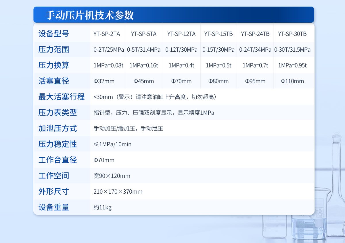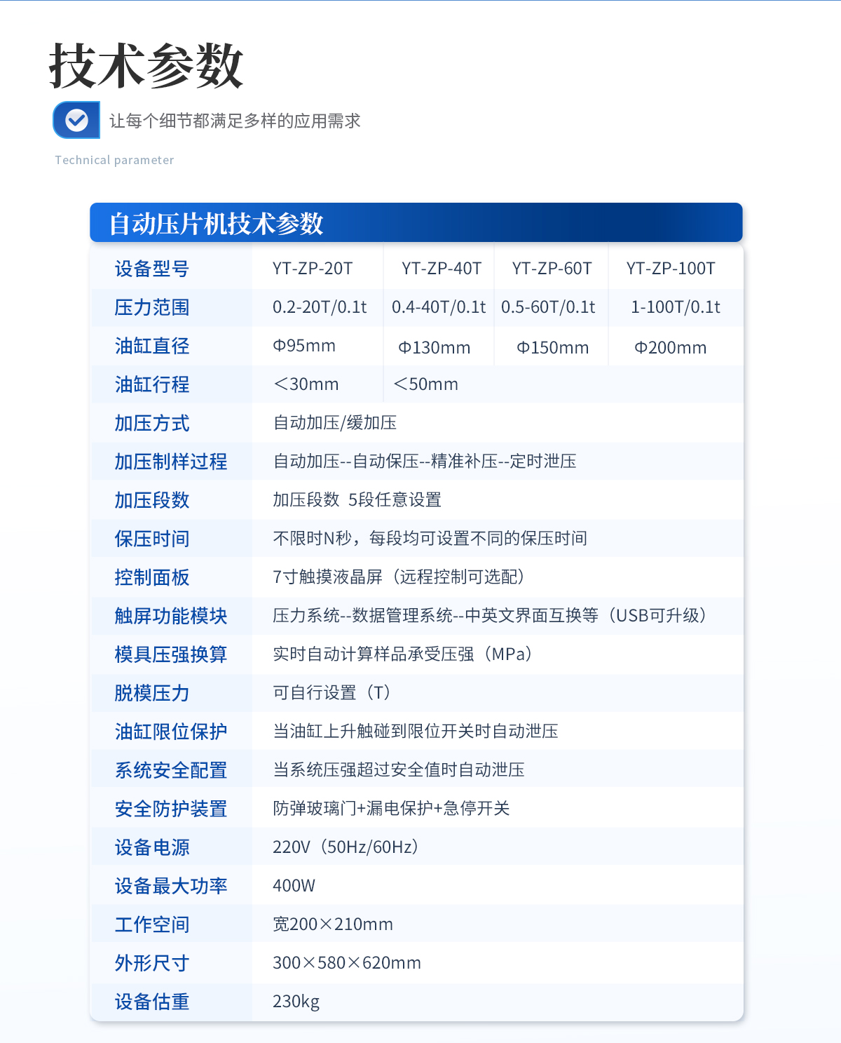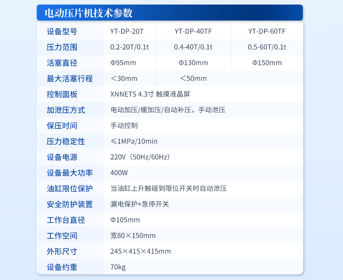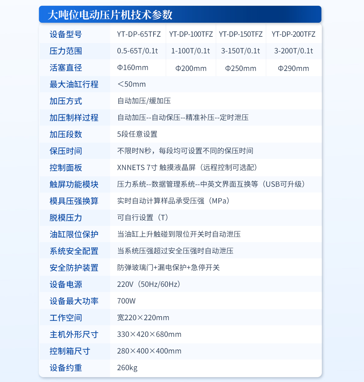 | 設(shè)備型號(hào):YT-DP-65TFZ | 壓力范圍:0.5-65T/0.1t | 油缸直徑:Φ160mm | 油缸行程 :<50mm | 加壓方式:自動(dòng)加壓/緩加壓 | 加壓制樣過程:自動(dòng)加壓--自動(dòng)保壓--精準(zhǔn)補(bǔ)壓--定時(shí)泄壓 | 加壓段數(shù):5段任意設(shè)置 | 保壓時(shí)間:不限時(shí)N秒,每段均可設(shè)置不同的保壓時(shí)間 | 控制面板:XNNETS 7寸 觸摸液晶屏(遠(yuǎn)程控制可選配) | 觸屏功能模塊:壓力系統(tǒng)--數(shù)據(jù)管理系統(tǒng)--中英文界面互換等(USB可升級(jí)) | 模具壓強(qiáng)換算:實(shí)時(shí)自動(dòng)計(jì)算樣品承受壓強(qiáng)(MPa) | 脫模壓力:可自行設(shè)置(T) | 油缸限位保護(hù):當(dāng)油缸上升觸碰到限位開關(guān)時(shí)自動(dòng)泄壓 | 系統(tǒng)安全配置:當(dāng)系統(tǒng)壓強(qiáng)超過安全值時(shí)自動(dòng)泄壓 | 安全防護(hù)裝置:防彈玻璃門+漏電保護(hù)+急停開關(guān) | 設(shè)備電源:220V(50Hz/60Hz) | 設(shè)備**功率:700W | 工作空間:寬220×220mm | 主機(jī)外形尺寸:330×420×680mm | 控制箱尺寸:280×400×400mm | 設(shè)備約重 :260kg | 配置說明:主機(jī)1臺(tái),控制箱1臺(tái)!模具選配!可根據(jù)需求定制壓片機(jī)或模具 |