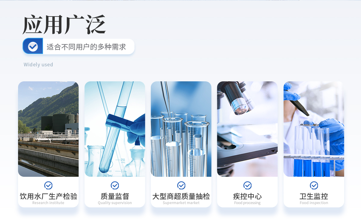能夠廣泛的應(yīng)用于飲用水廠生產(chǎn)檢驗(yàn)、市場(chǎng)監(jiān)督部門質(zhì)量監(jiān)督、大型商超質(zhì)量抽檢、疾病控制中心、衛(wèi)生監(jiān)控等。