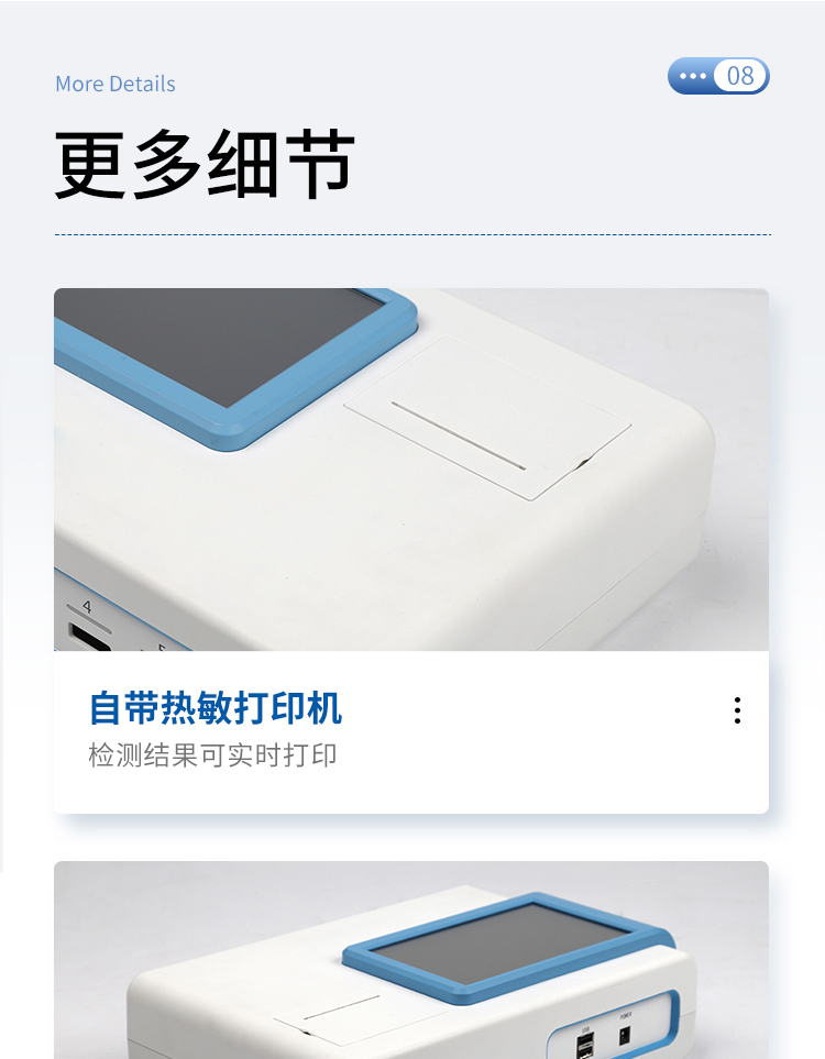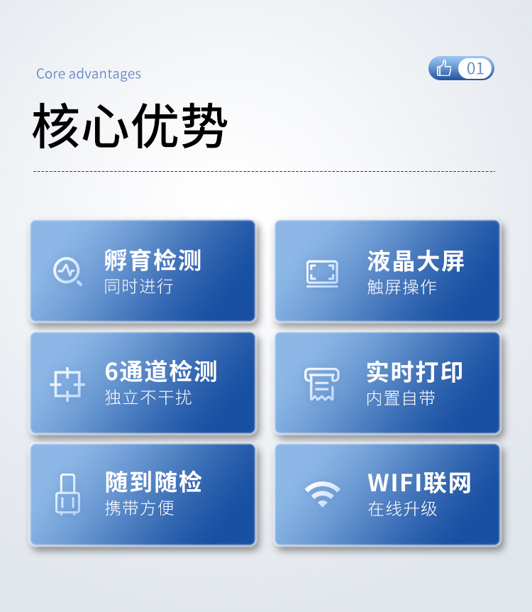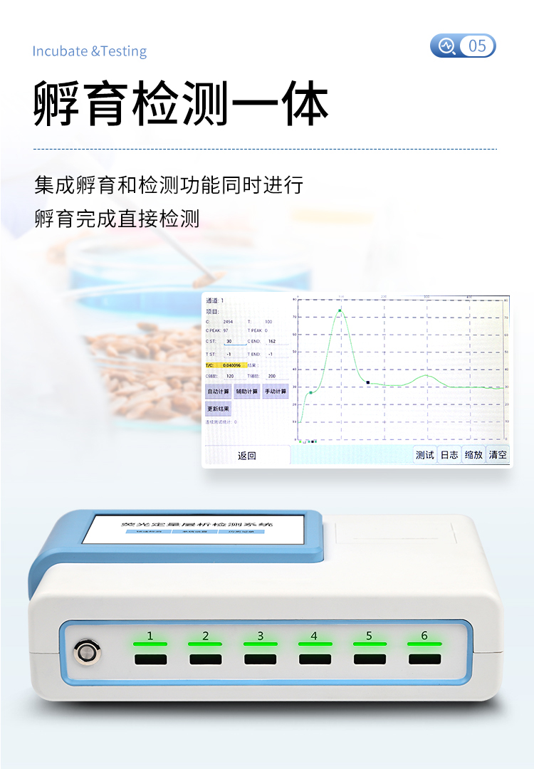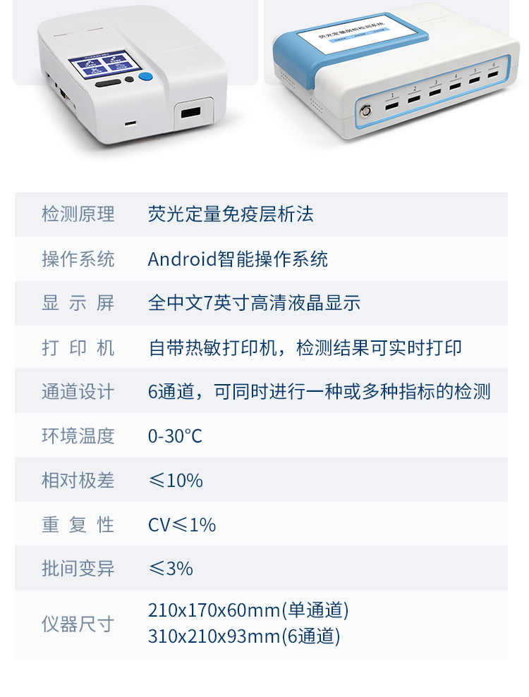 | 一體化設計,集成孵育和檢測功能同時進行,孵育完成直接檢測; | 全中文 7英寸高清液晶顯示,觸摸屏操作; | Android 系統(tǒng),支持在線升級,可WIFI聯網; | 檢測原理:熒光定量免疫層析法; | 6通道設計,可同時進行一種或多種指標的檢測,6個獨立檢測單元,檢測效率高,并且互不干擾; | 具有二維碼自動識別系統(tǒng),可直接識別檢測項目、檢測流程等信息; | 儀器自帶熱敏打印機,檢測結果可實時打印; | 具有檢測數據存儲(存儲數量不少于 10000 條)、查詢、批量數據處理和打印功能; | 儀器≥2 個USB 接口,可拷貝結果及原始數據,具有 wifi 接入模塊,可通過無線連接網 絡實現數據上傳; | 分鐘內達到工作狀態(tài)(37℃),封閉系統(tǒng),不受外界環(huán)境(光、熱)干擾,工作環(huán)境溫度:0-30℃; | 相對極差≤10%; | 重復性 CV≤1%; | 批間變異≤3%; | 尺寸310x210x93mm |