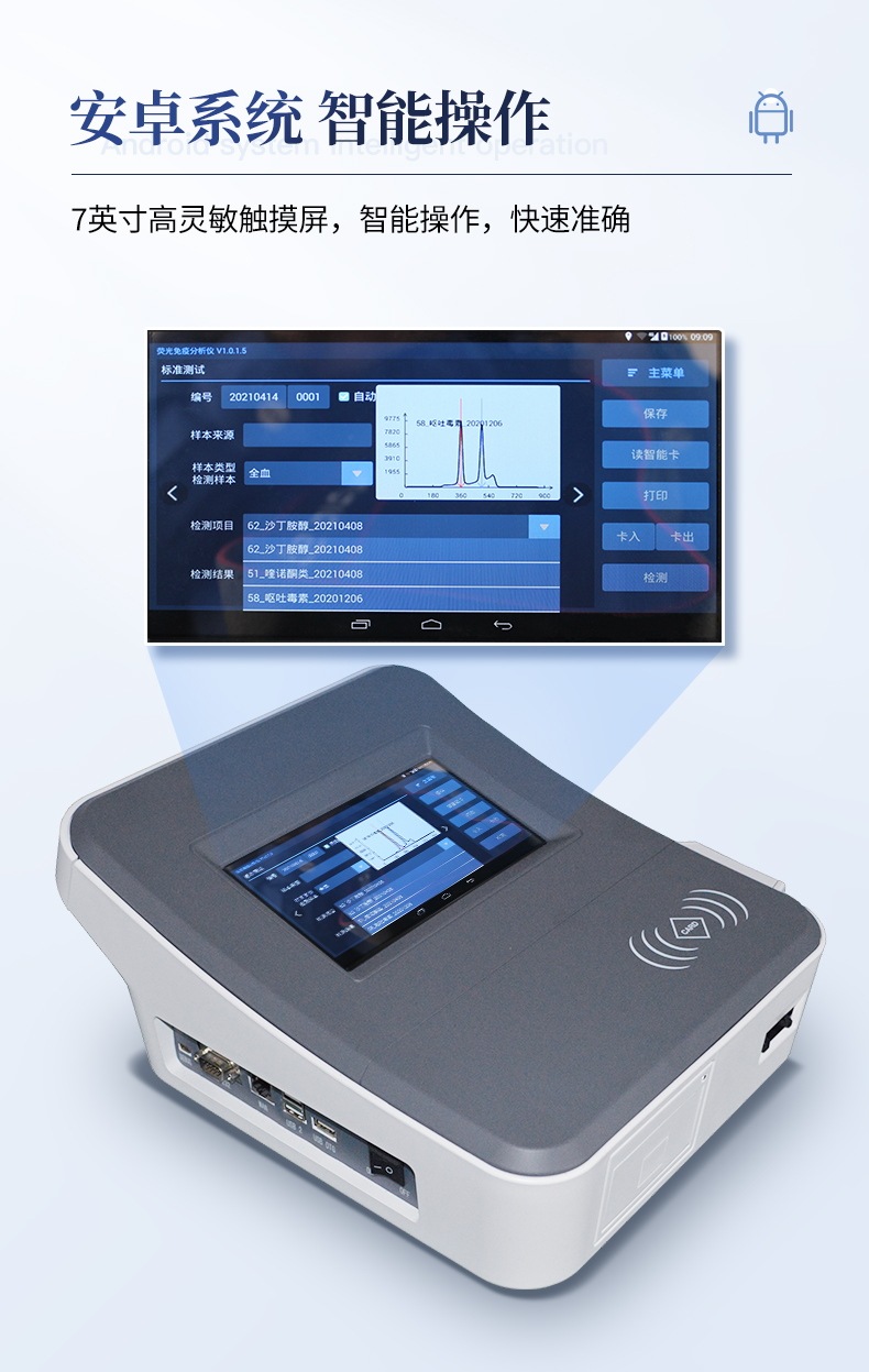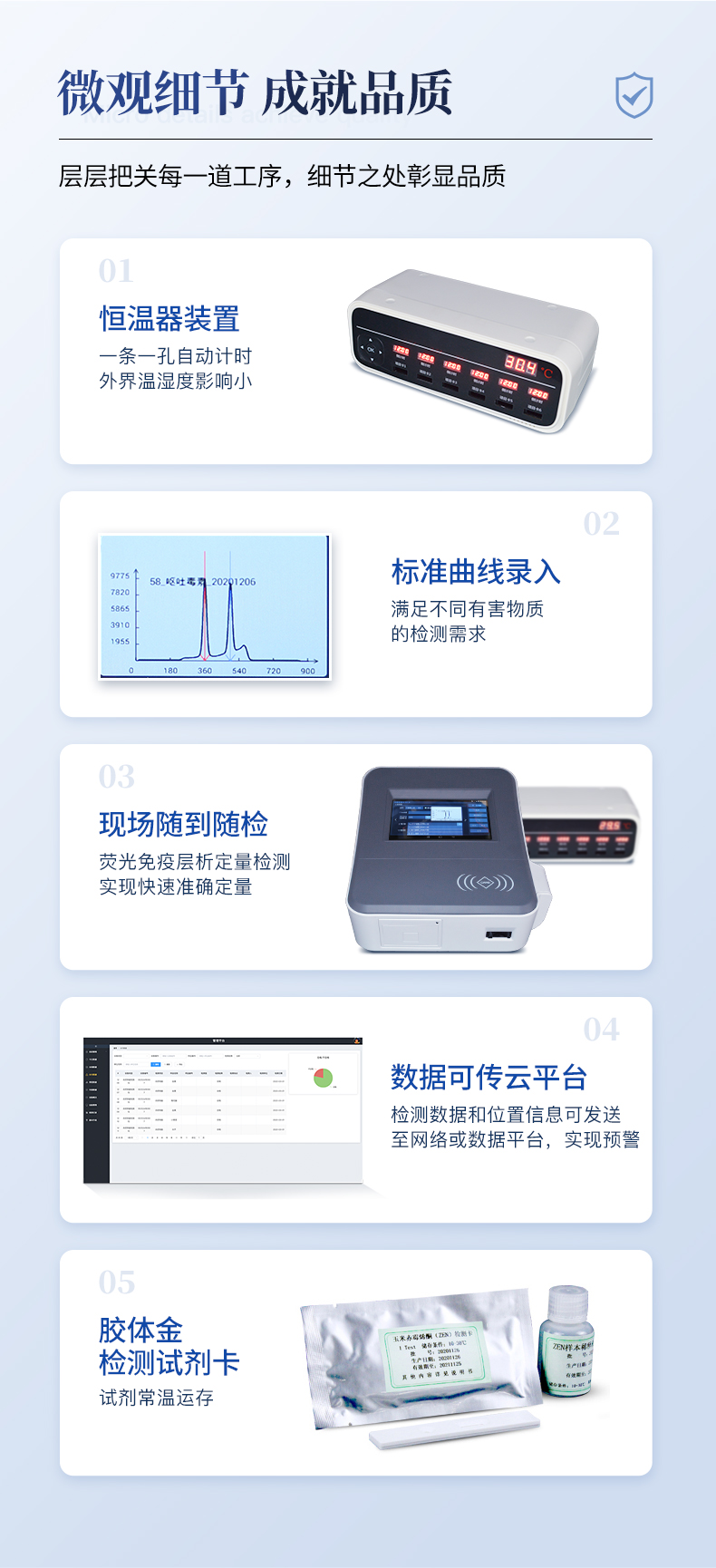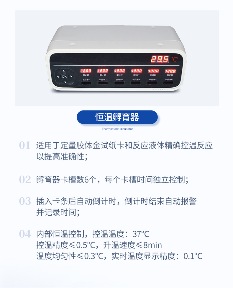 | 1、儀器自動識別檢測卡條形碼上的檢測項目、樣本類型、檢測限、標準曲線,形成完整的檢測數據信息鏈。一卡一控,插卡后儀器自動讀取檢測卡顯示的C、T線的熒光信號,依據檢測卡內置的標準曲線,自動計算結果;用戶可根據自身需求,選擇設定檢測限/定量限(內控或****限量)。 | 2、檢測數據信息采集項目(包括但不限于):儀器至少支持以下檢測數據采集:①檢測項目;②樣本類型;③檢測樣本;④國家限量;⑤檢測者;⑥檢測單位;⑦檢測時間;⑧檢測線/定量限;⑨檢測編號;⑩內控限量 樣本來源等,并支持數據采集項目遠程擴展升級。 | 3、檢測數據采集方式:檢測數據信息采集項目中載明的:①-⑨項為儀器自動識別采集,⑩項為手寫輸入。 | 4、檢測數據上傳方式:完成檢測后,儀器能自動將檢測數據信息采集項目載明的全部檢測數據信息上傳至檢測監(jiān)管系統(tǒng)平臺。 | 5、接口:藍牙通訊接口;內置無線WIFI,檢測數據實時傳輸到數據監(jiān)管平臺,客戶可通過賬號登陸在網絡上實時查看檢測數據 | 6、存儲空間:存儲空間16GB。 | 7、信息輸入:支持中英文手寫輸入。 | 8、本機數據管理:具有檢測數據存儲、查詢,批量數據刪除和打印等功能。 | 9、檢測項目管理:儀器支持檢測項目及對應國家限量遠程增加、刪除等維護管理。 | 10、操作權限管理:儀器支持檢測操作人員使用賬號、密碼登陸儀器的功能,支持賬號、密碼在監(jiān)管系統(tǒng)平臺進行驗證。 | 11、在線學習:內置檢測項目操作流程簡圖,教學軟件可實時在線更新。 | 12、工作溫度:5-40℃,相對濕度:10%-90%。電源電壓220V±22V,頻率50Hz±1Hz,額定功率40W,與電源的連接方式:可拆卸電源線。 | 13、恒溫孵育器 | (1)適用于定量膠體金試紙卡和反應液體準確控溫反應,以提高準確性; | (2)孵育器卡槽數6個,每個卡槽時間獨立控制; | (3)插入卡條后自動倒計時,倒計時結束自動報警,并記錄超時時間; | (4)內部恒溫控制,控溫溫度:37℃,控溫精度≤0.5℃,升溫速度≤8min,溫度均勻性≤0.3℃,實時溫度顯示精度:0.1℃。 |